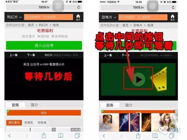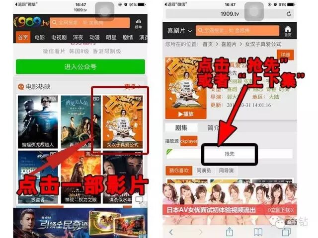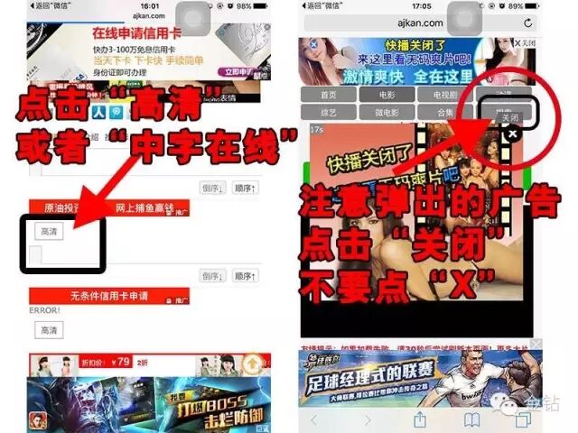 将告关闭后,往下翻页面,点击“高清”或者“中字在线”的字样,将弹出的广告关闭,注意一定要点上方的“关闭”而不是“X”,也不要下载其他的播放器。关闭广告后等待几秒就可以观看电影了。