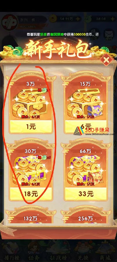 新手礼包:1圆给3w金币+1奖券,18元给30w金币+9奖券
