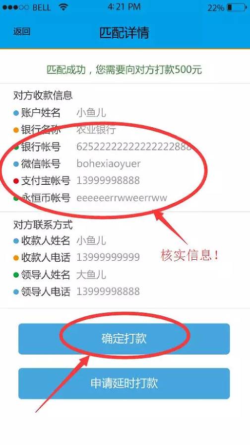 注意核对收款人信息,有必要时请电话联系,确认好信息之后,可以通过支付宝、银行卡、借贷宝转账,转账成功之后请将转账记录截图,然后再回到领航者APP内,点击确定打款。