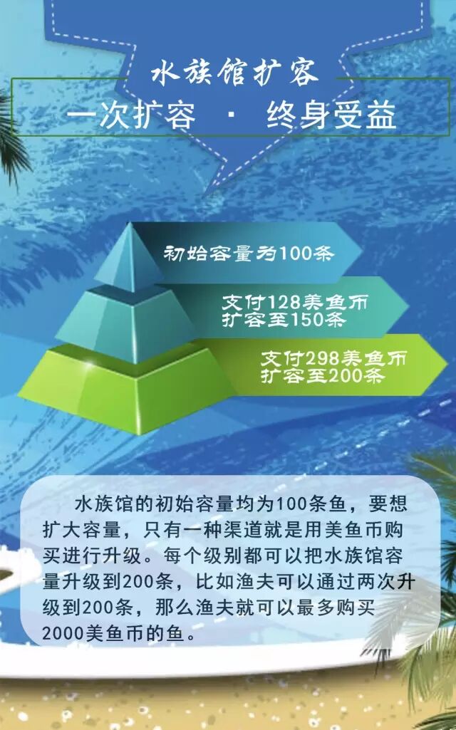 水族馆的起初容量都是100条鱼(无论什么级别,馆长最多也只能100条),要想扩大容量,只有一种渠道就是现金支付升级。从100条升级到150条容量需要支付128美鱼币,从150条升级到200条容量需要支付298没鱼币。每个级别都可以把水族馆容量升级到200条,比如渔夫可以通过两次升级到200条,那么渔夫就可以最多购买2000美鱼币的鱼。