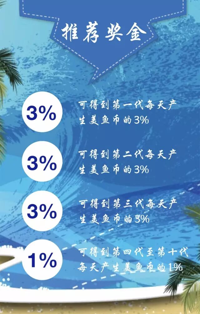 渔翁:直推五个渔夫升级为渔翁,渔翁可以购买20美鱼币一条的鱼,渔翁能拿前五代推荐奖