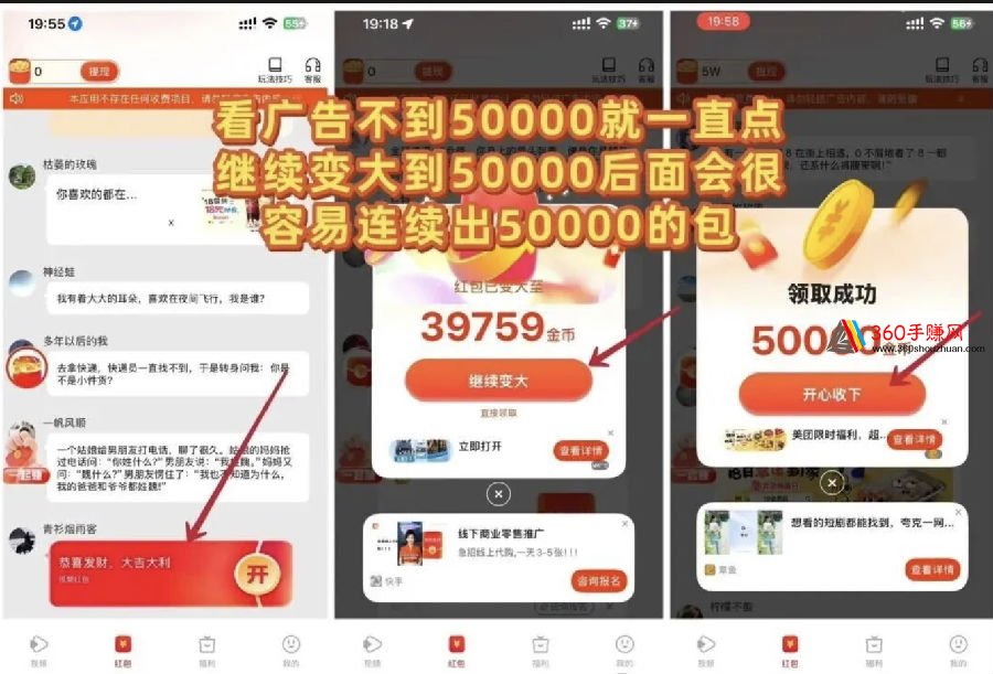 锦鲤夺宝 一个广告0.5左右,红包没到0.5先不领取,等0.5在开包容易一次性出连包0.5,满1即提秒到绿泡泡