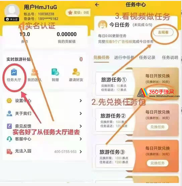3,关于任务:认证后用系统送的10券点在任务大厅兑换旅游任务①,再点击上面的去观看,看5个视频完成任务获得0.4券点。