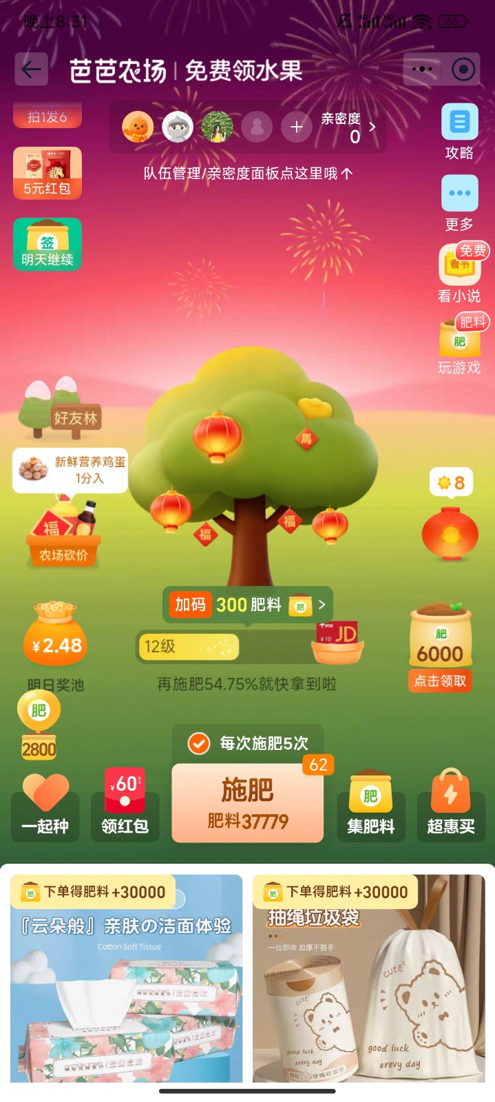下拉可以看到很多商品,下单给30000肥料,可以用省钱卡领的红包,几毛钱下单。