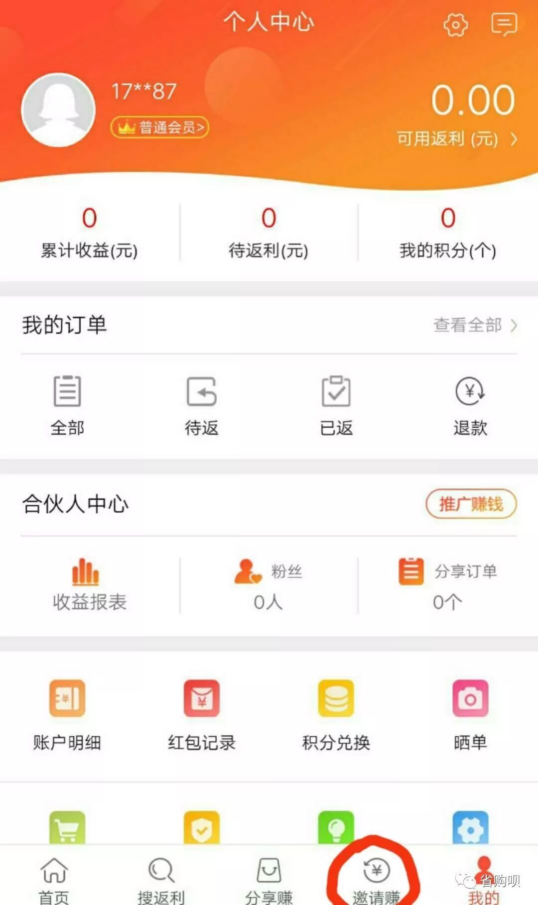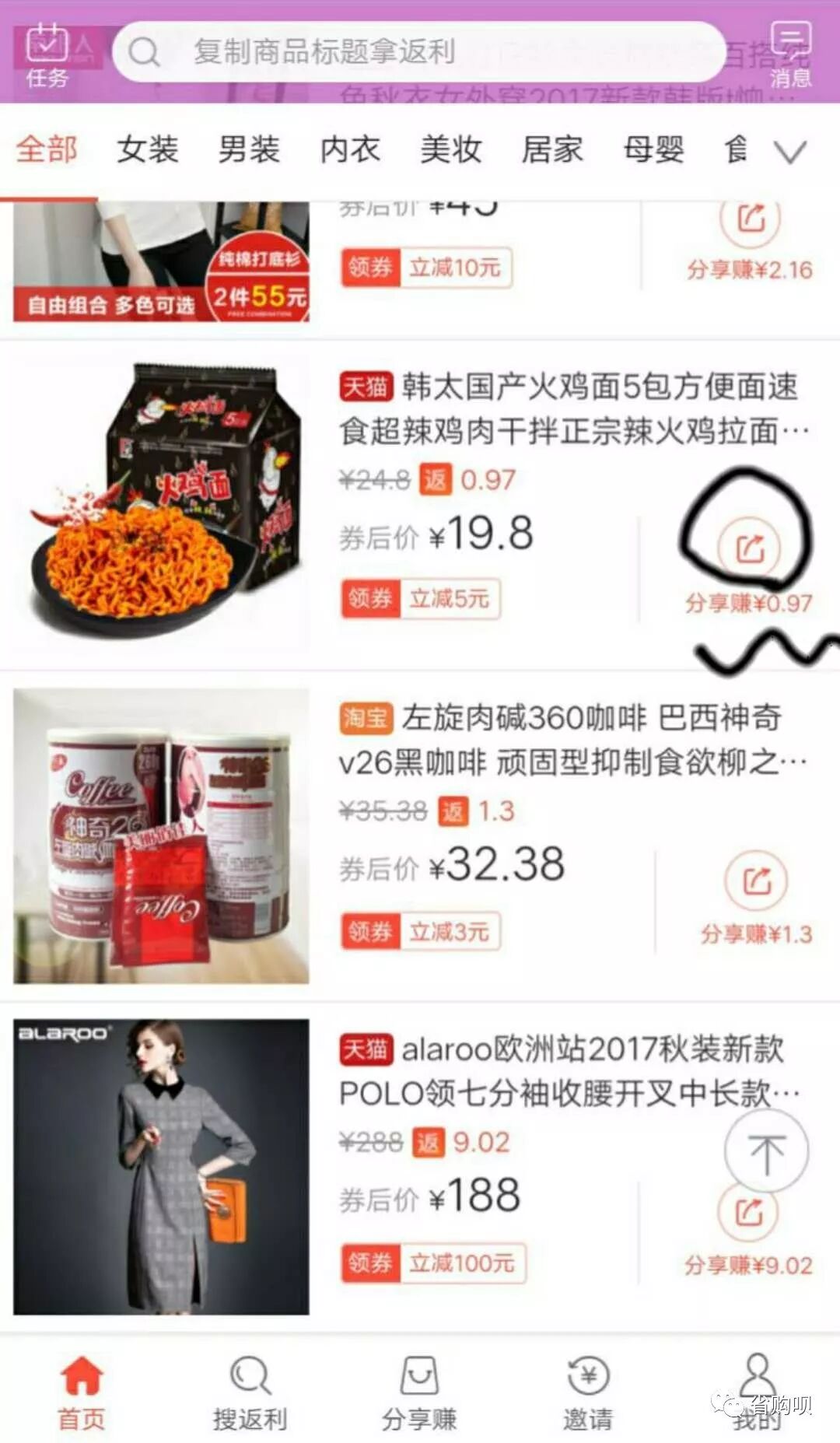 首页的下面商品是推荐商品,卖的比较火的和非常优惠的优惠券,上面分享赚下面的数字是买东西后获得的提成,也可以分享给别人,别人买了后获得这些提成